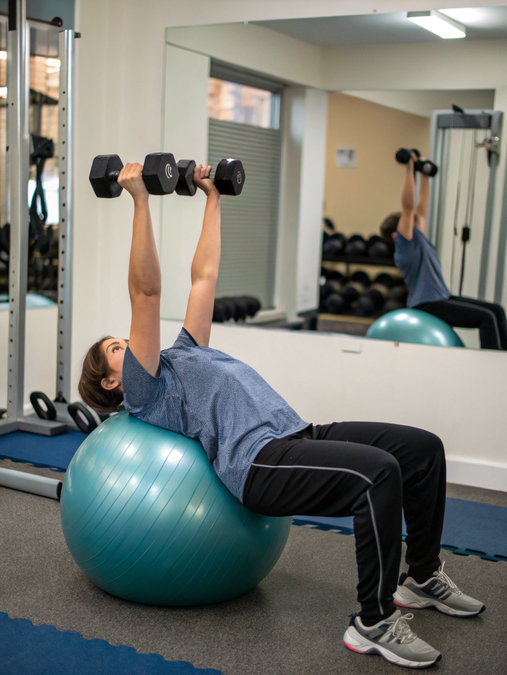أمسك الدمبل في كلتا اليدين على مستوى الكتفين، ثم اضغط للأعلى بحركة متحكمة. تأكد من عدم تقويس الظهر بقوة، واستخدم عضلات البطن للحفاظ على الاستقرار. انزل بسيطرة كاملة ولا تدع الأوزان تهبط بسرعة.
