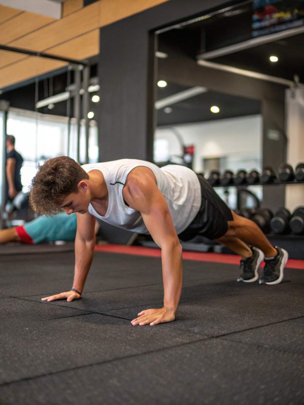 ابدأ في وضع اللوح مع راحتي اليدين على الأرض أوسع قليلاً من الكتفين. انزل صدرك ببطء حتى يلامس الأرض تقريبًا، ثم ادفع بقوة للعودة للوضع الأولي. احرص على إبقاء جسمك في خط مستقيم من الرأس للكعبين، وشدّ عضلات البطن طوال الحركة.